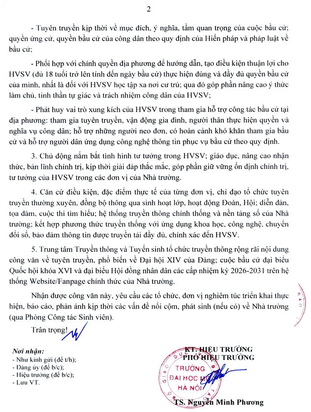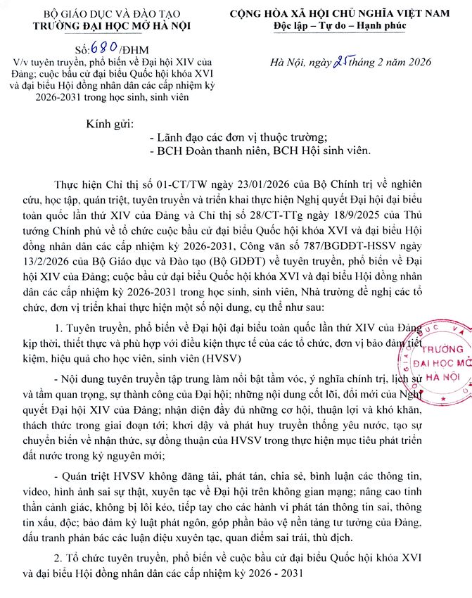 Công văn Tuyên truyền, phổ biến về Đại hội XIV của Đảng; cuộc bầu cử đại biểu Quốc hội khóa XVI và đại biểu Hội đồng nhân dân các cấp nhiệm kỳ 2026-2031 trong học sinh, sinh viên