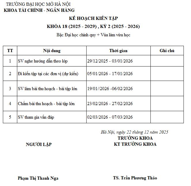 Kế hoạch học tập Học kỳ 2, năm học 2025 – 2026