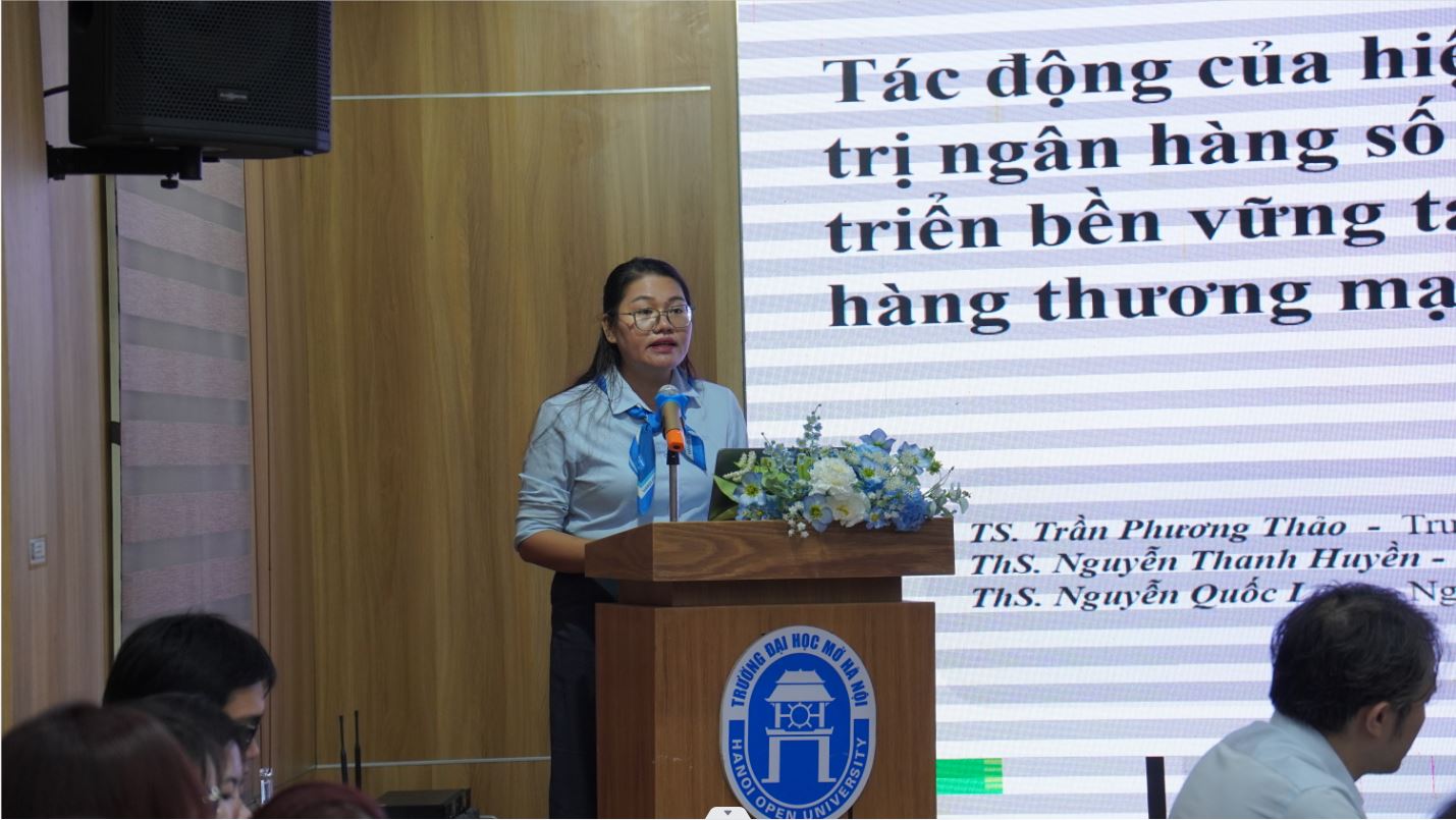 - TS. Trần Phương Thảo, Phó Trưởng khoa Tài chính – Ngân hàng – Trường ĐH Mở Hà Nội với tham luận “Tác động của hiệu quả quản trị ngân hàng số tới phát triển bền vững tại các ngân hàng thương mại Việt Nam”. Bài tham luận bằng phương pháp hồi quy tuyến tính và kiểm định tương quan Pearson đã đưa ra những kết quả rất thuyết phục. Trong đó, có các khuyến nghị: Đầu tư vào hệ thống dữ liệu và bảo mật thông tin, nâng cao chất lượng hạ tầng công nghệ và quản trị dữ liệu, bảo đảm tính đồng bộ, bảo mật và khả năng phân tích dữ liệu hiệu quả, xây dựng chiến lược chuyển đổi số toàn diện, có tầm nhìn dài hạn, kết hợp với đào tạo năng lực lãnh đạo số cho đội ngũ quản lý, thiết lập các chỉ số đo lường hiệu quả quản trị ngân hàng số và phát triển bền vững, từ đó hỗ trợ việc giám sát và điều chỉnh chiến lược phù hợp trong dài hạn.