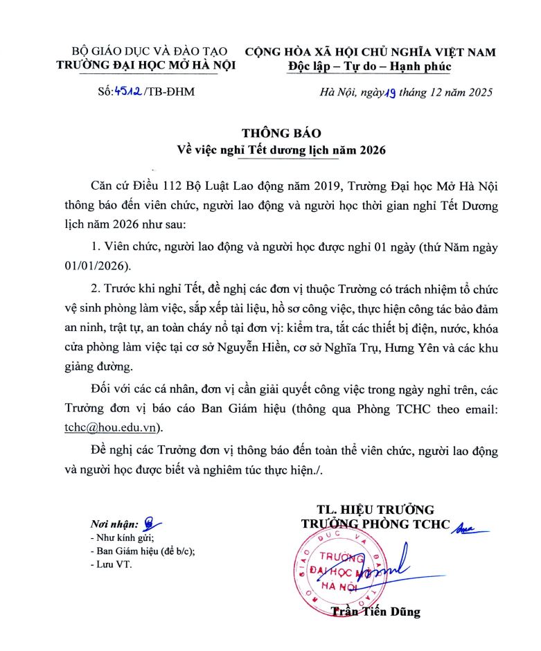 Thông báo lịch nghỉ Tết dương lịch 2023